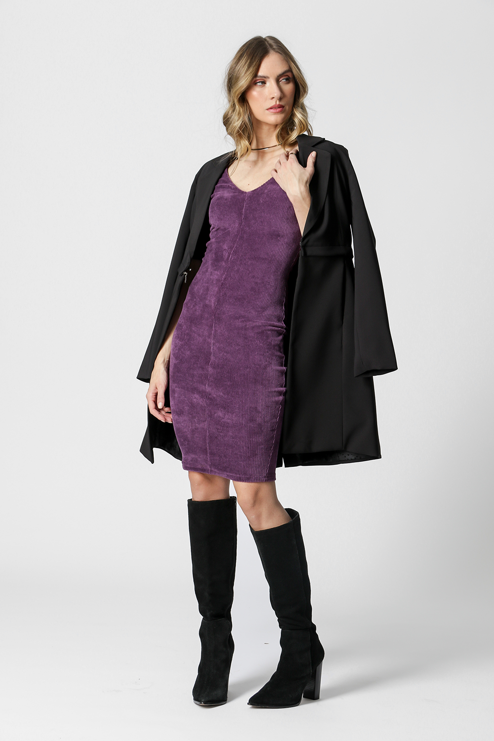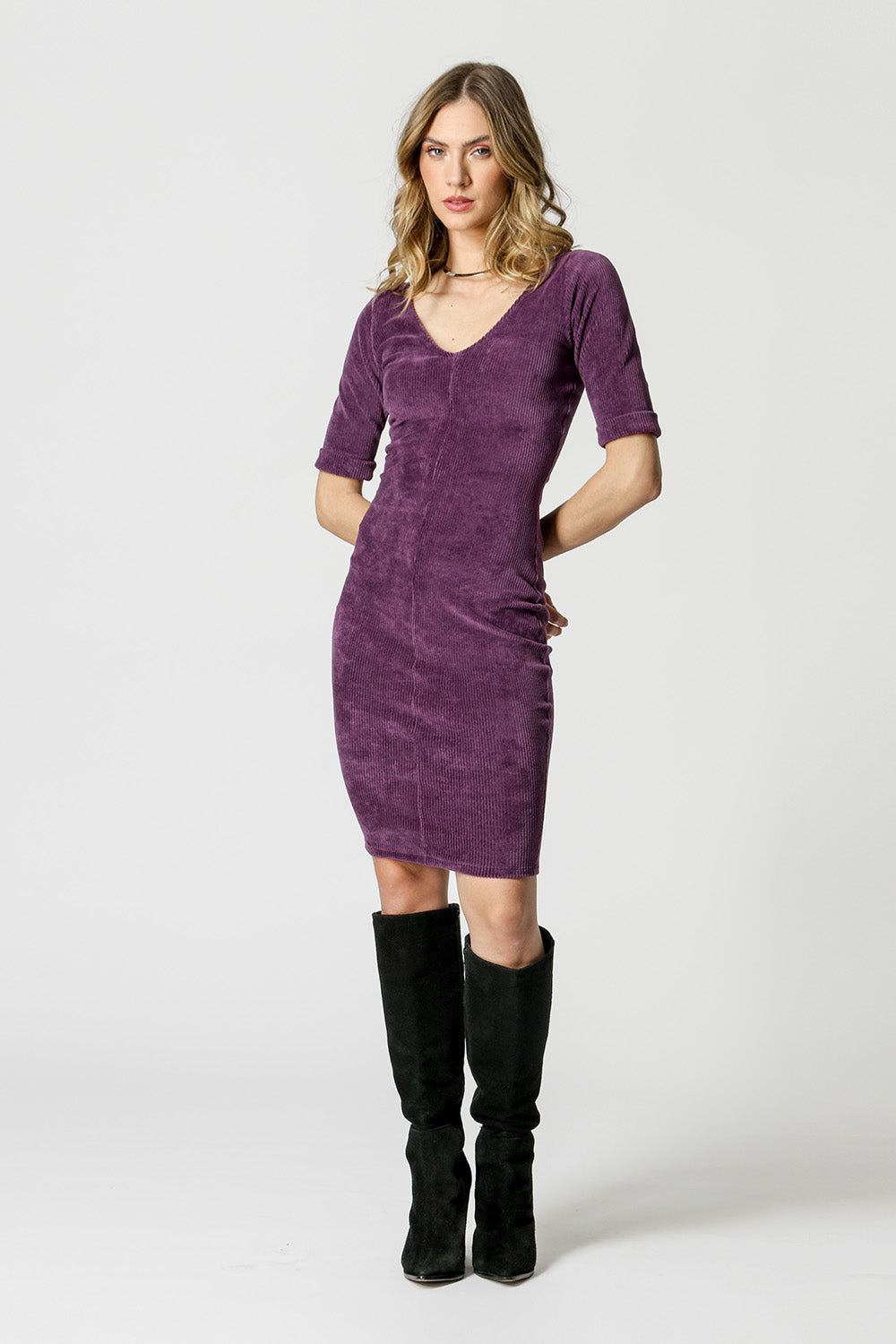 Vestido no comprimento médio com costas em V. Confeccionada em tecido cotelê lycra. Uma peça confortável e casual para arrasar.