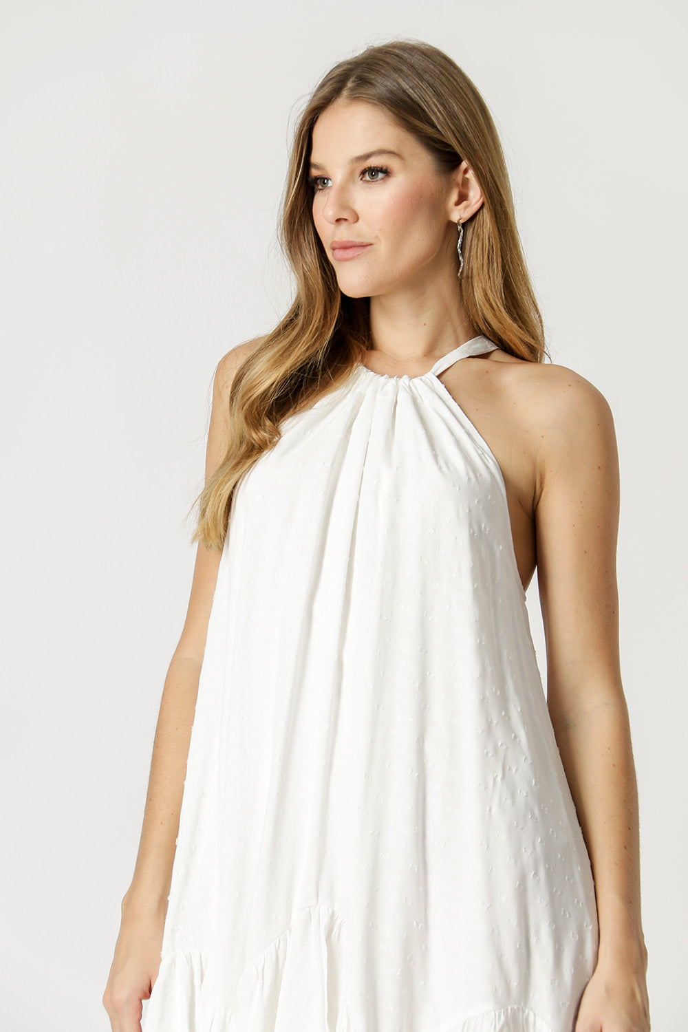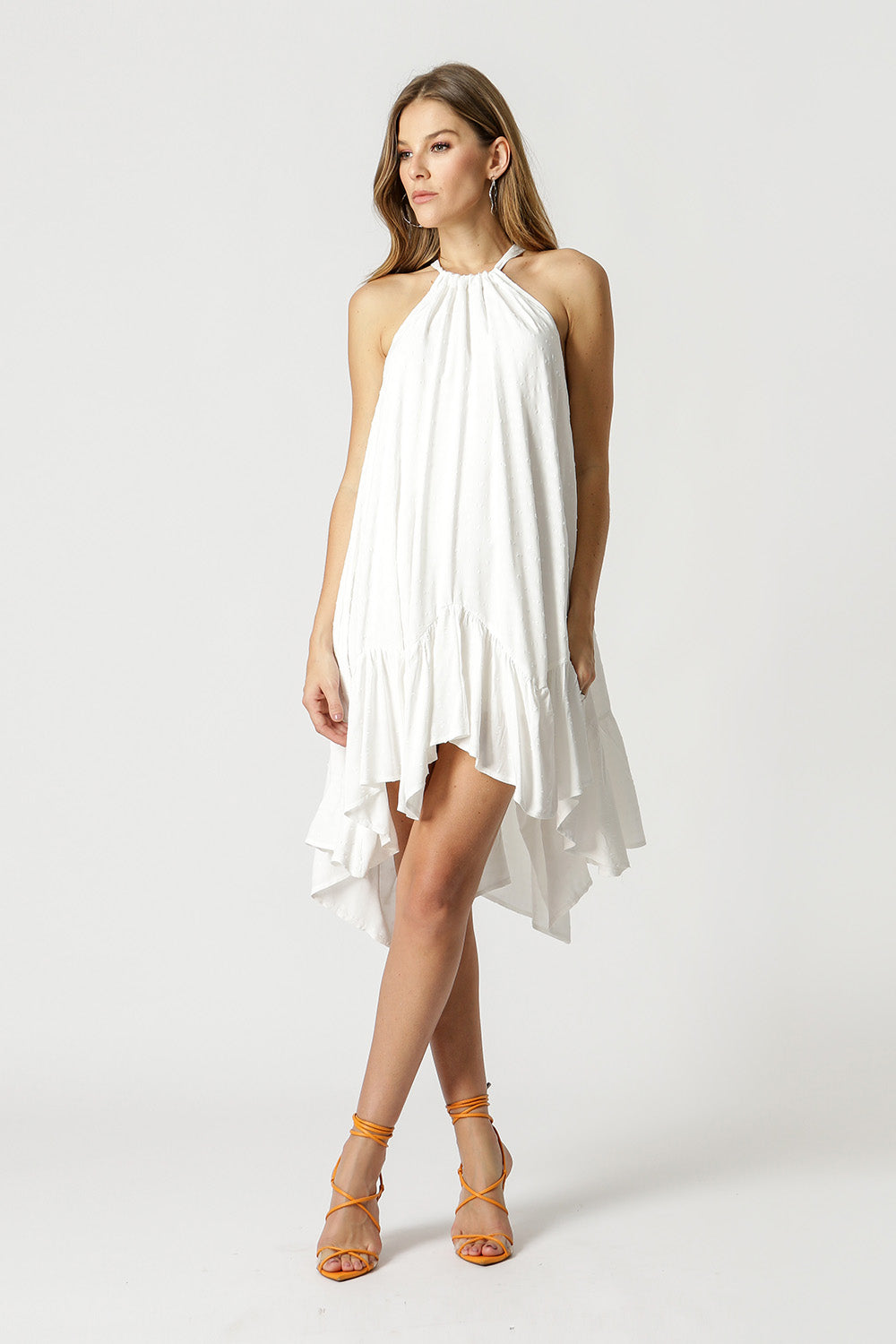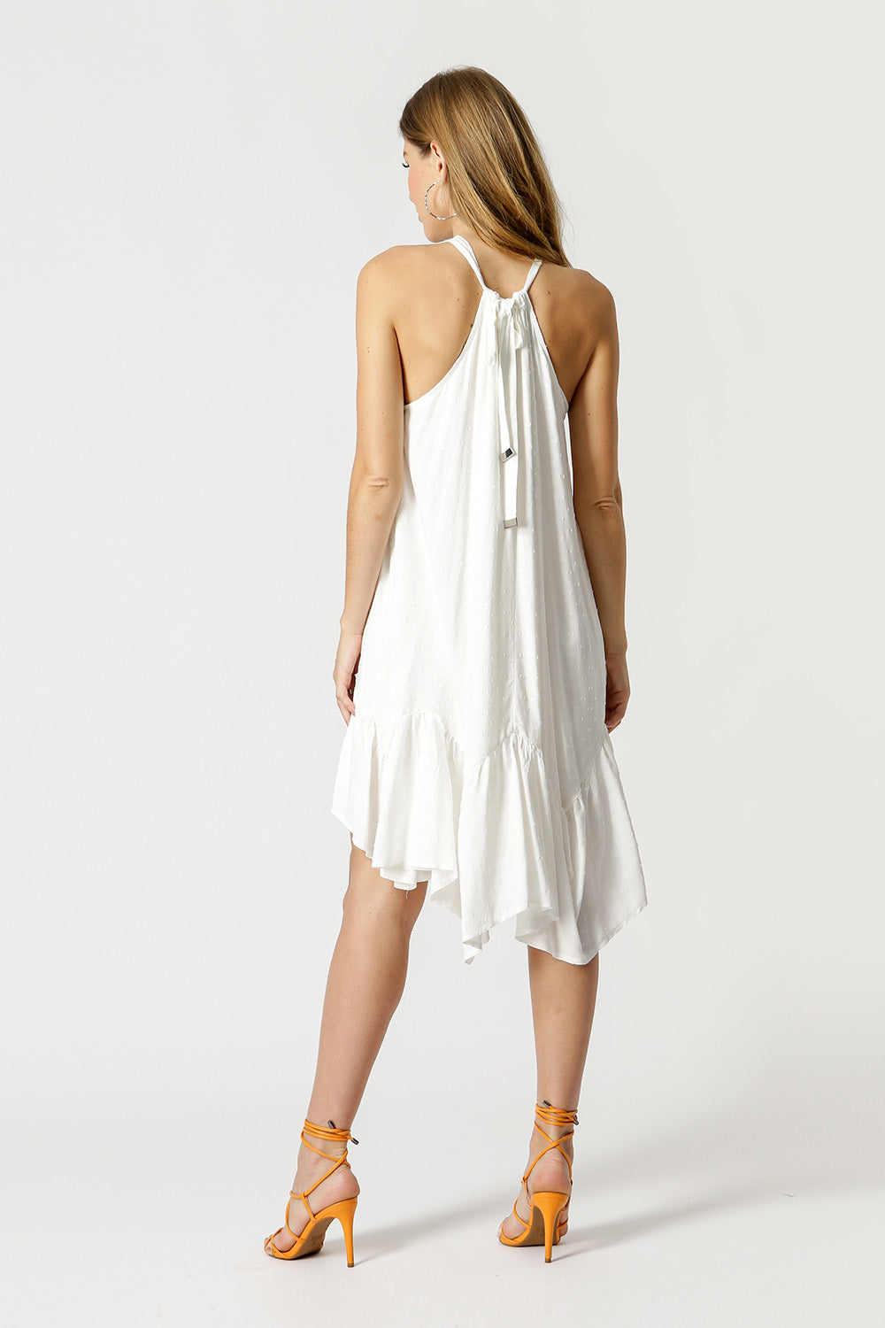 Vestido curto com recortes, franzidos e amarração na gola. Vestido soltinho e confortável para aproveitar a estação.