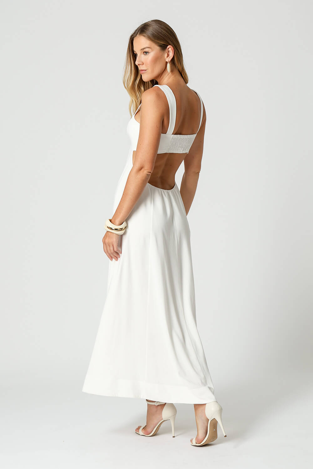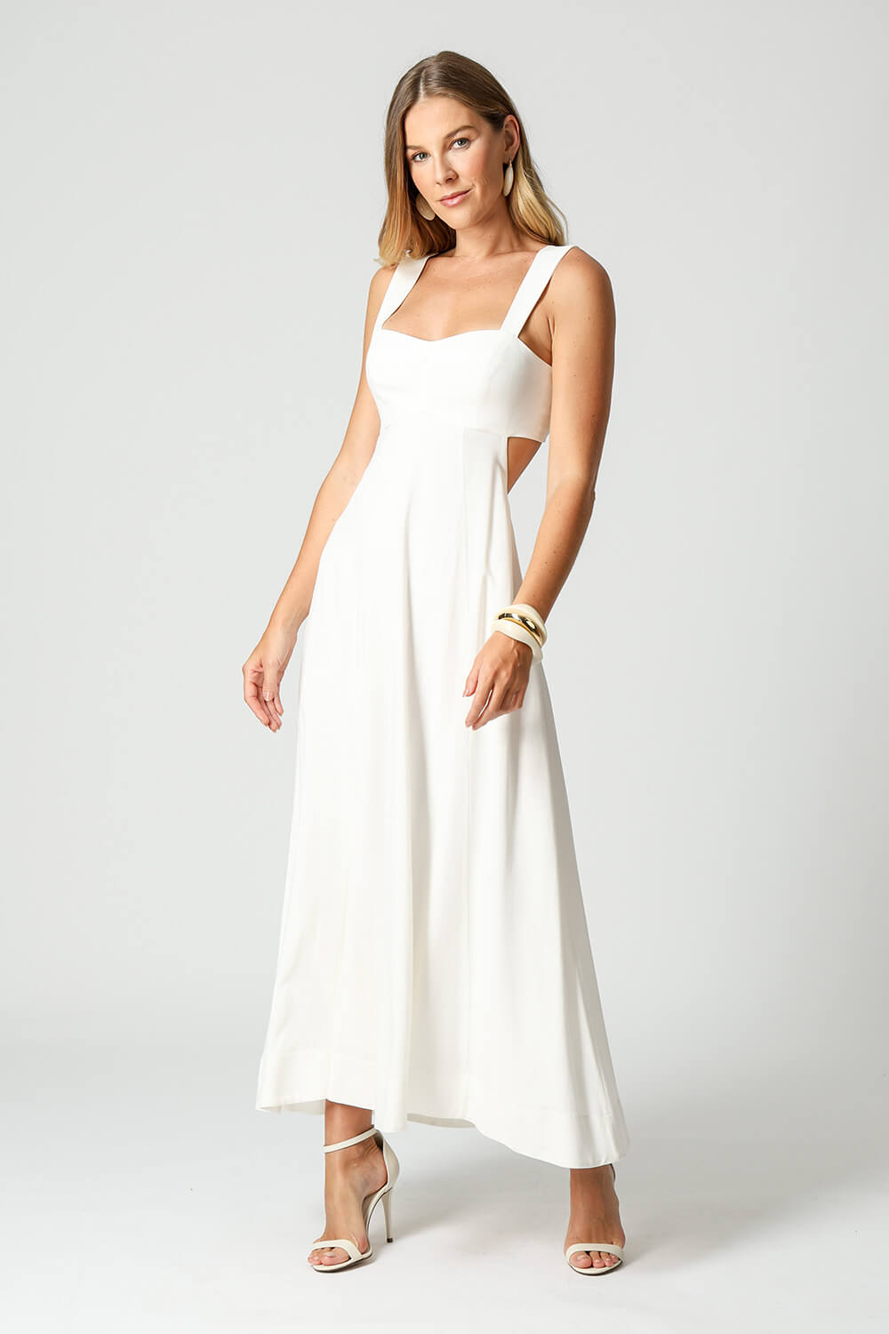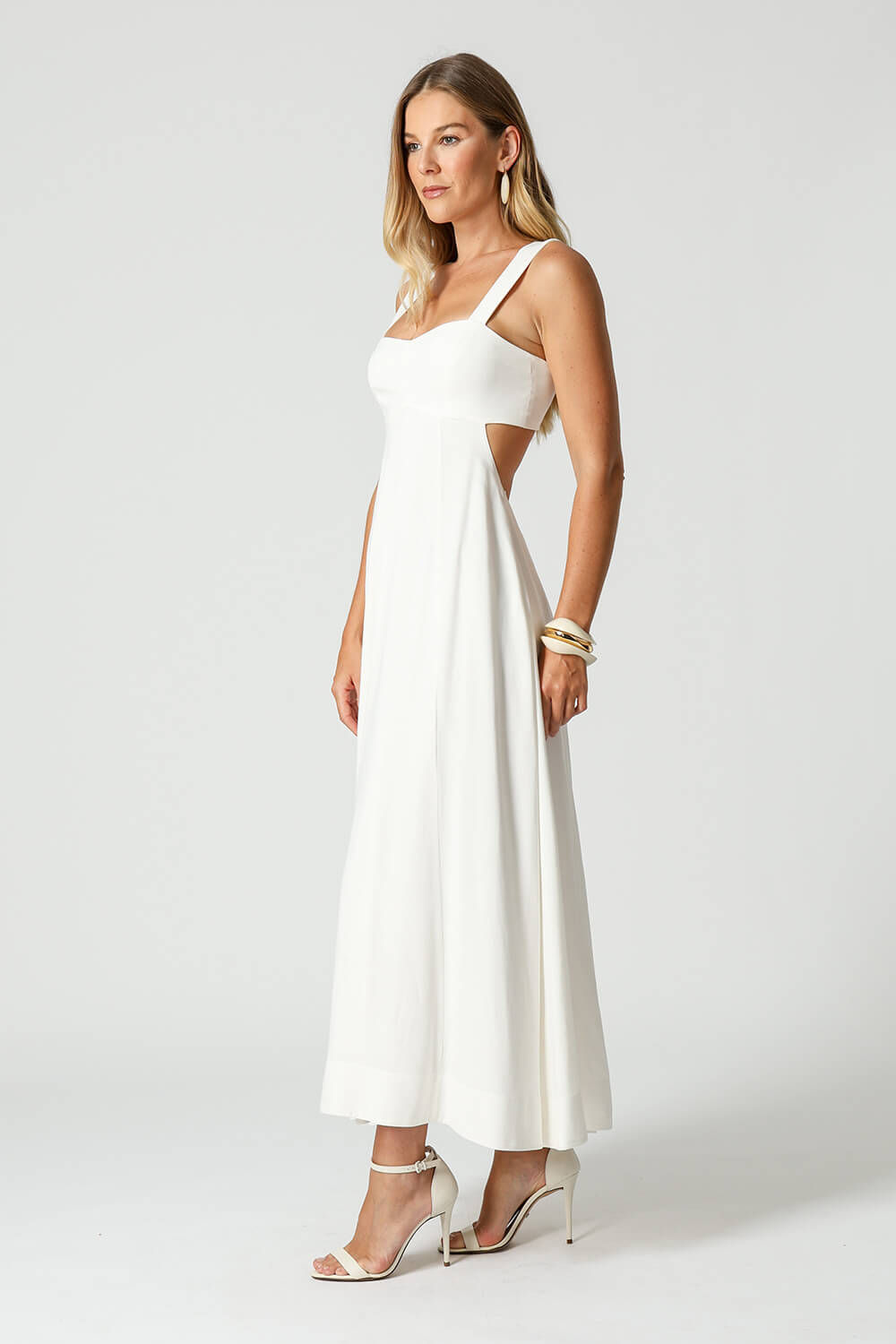 Vestido em linho com algodão, com alças largas, vazado iniciado na lateral, costas abertas e recortes no busto e na saia. Leve e sofisticado, ideal para produções modernas.