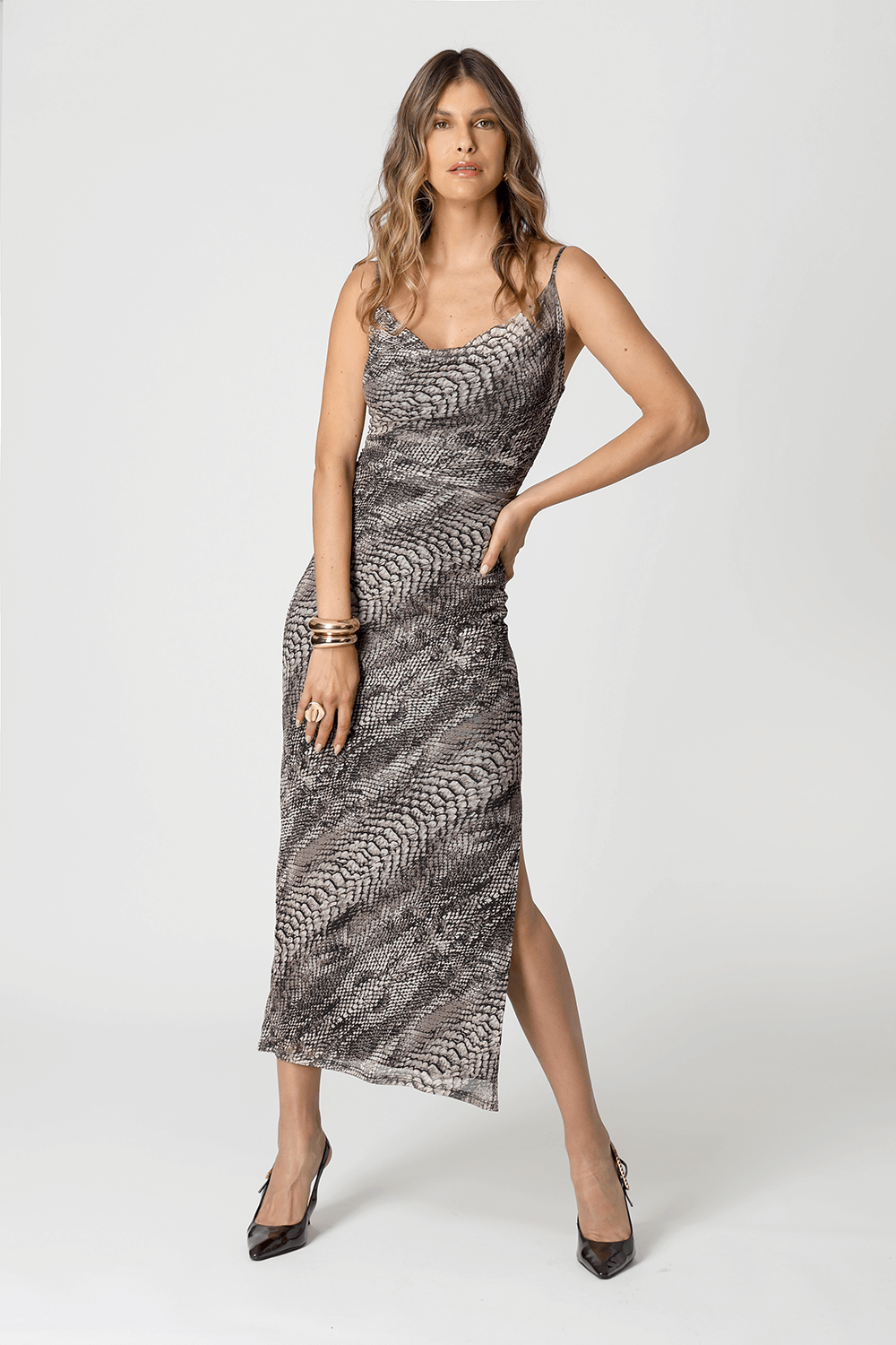 Detalhe de leve drapeado e fenda lateral