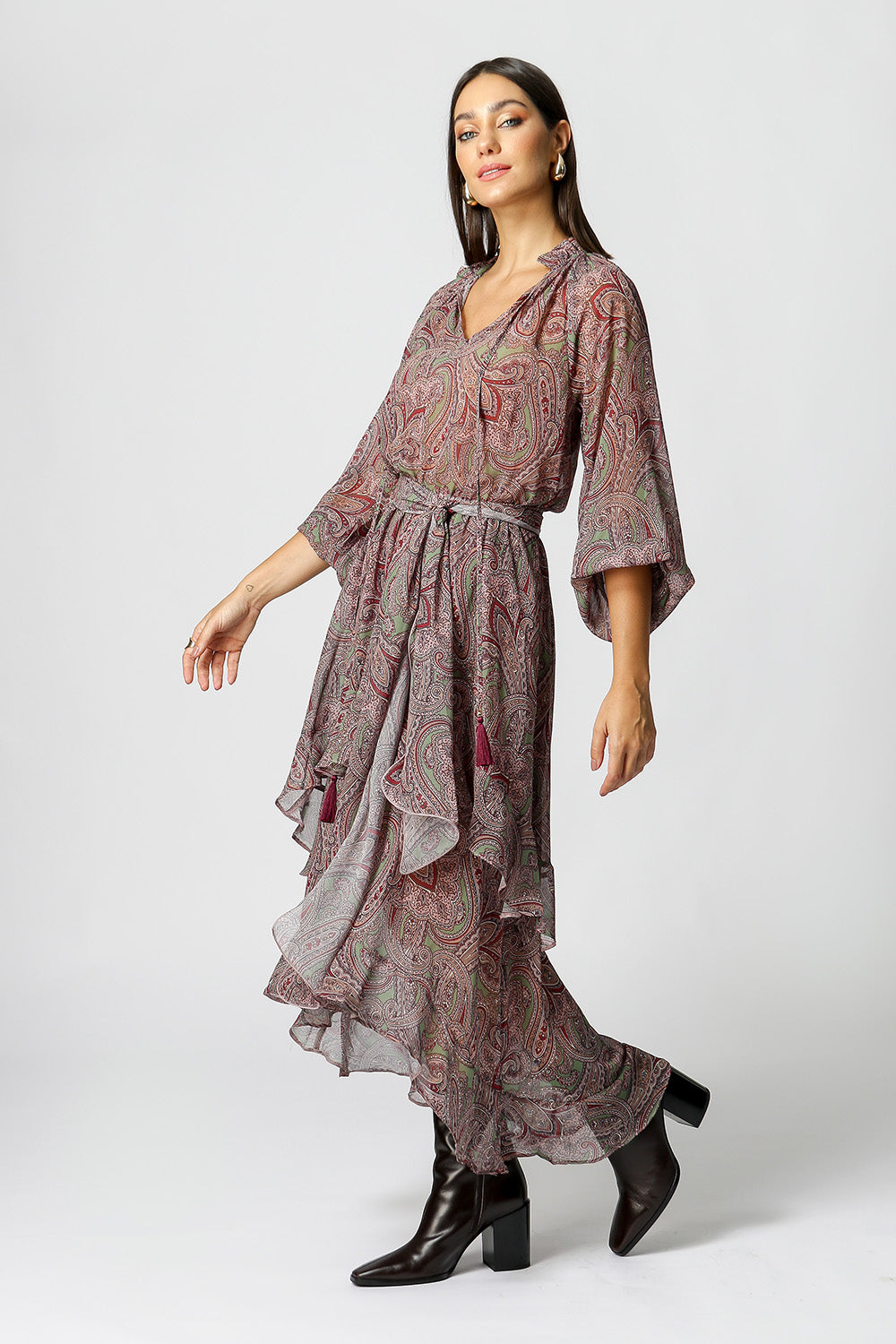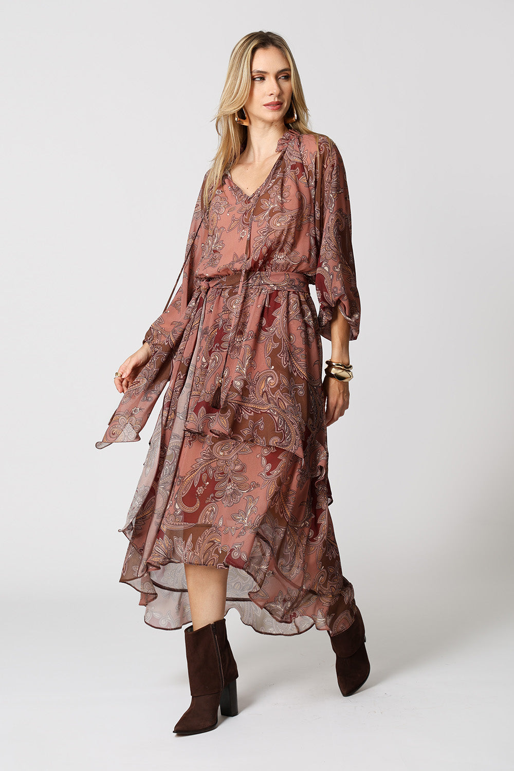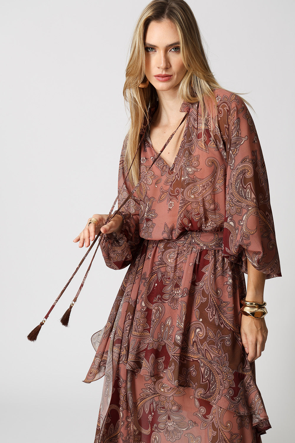 Vestido midi estampado com babados e camadas. Possui ponteiras em tassel com detalhe de metal e cor em destaque, e acompanha faixa removível do mesmo tecido. Peça romântica e fluída com influência boho, aposte!