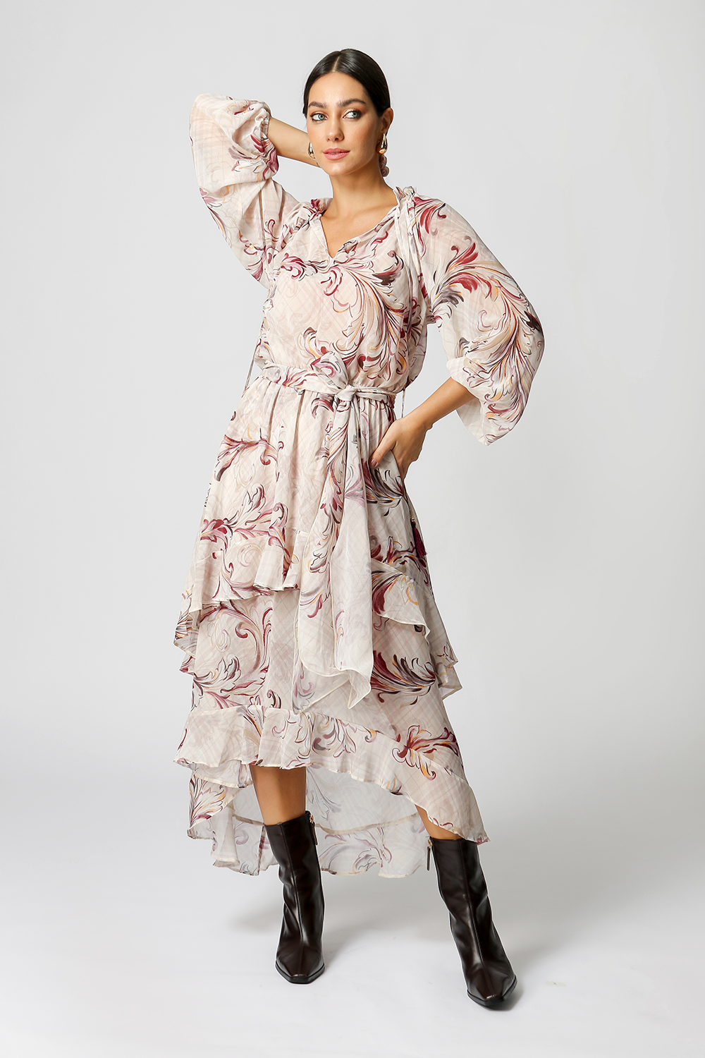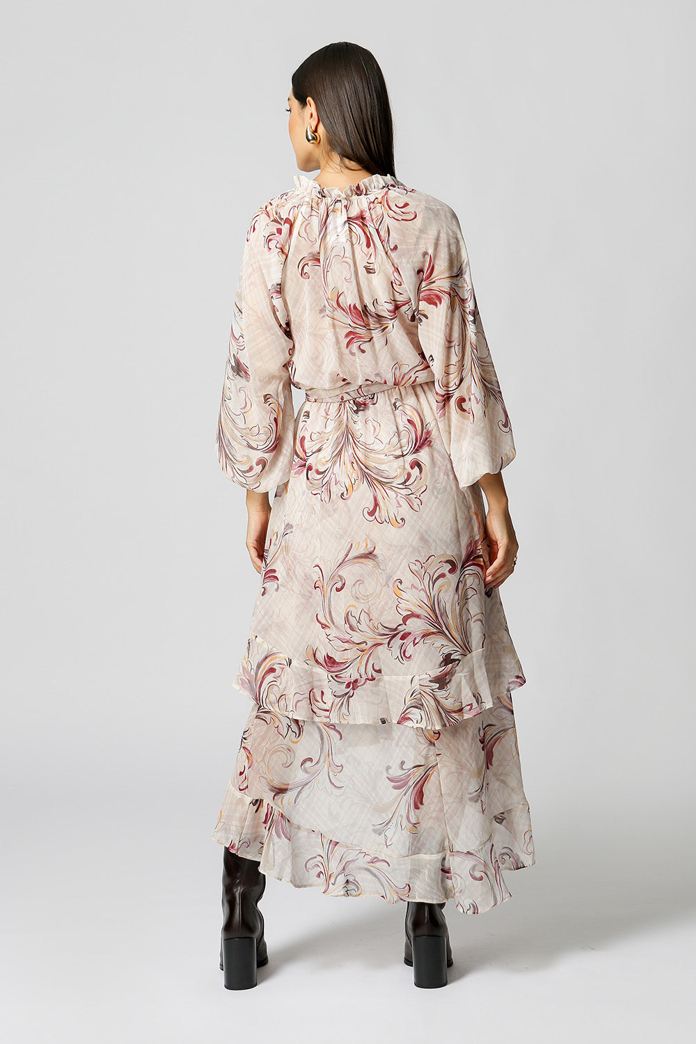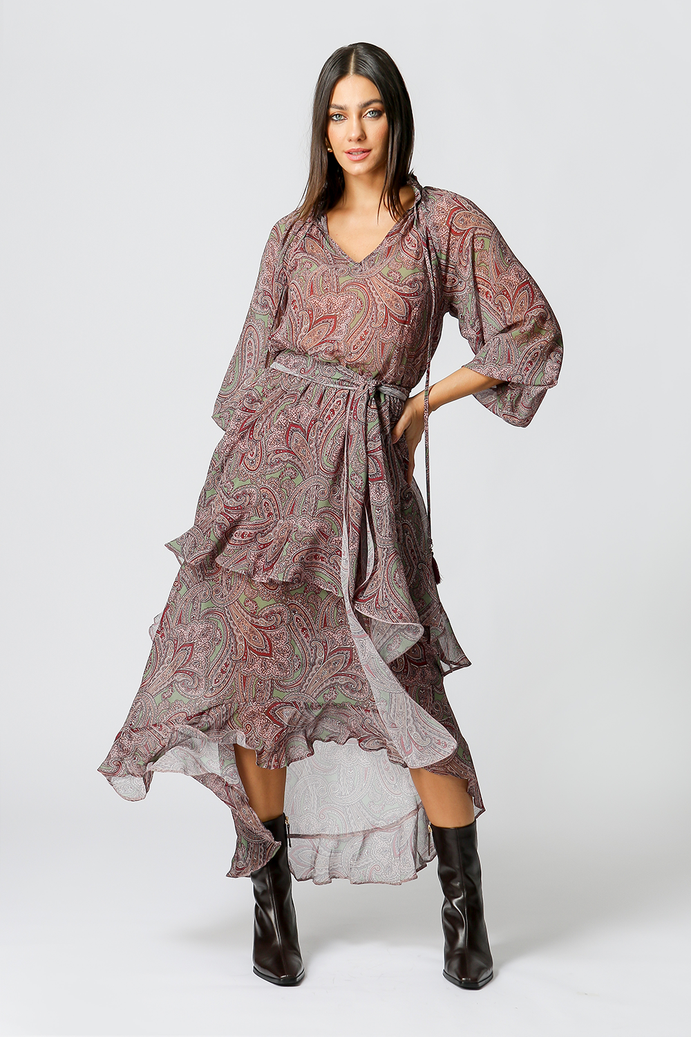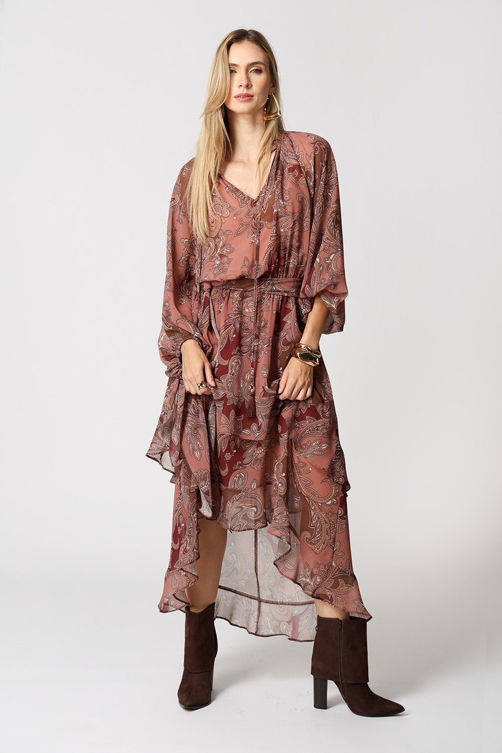 Vestido midi estampado com babados e camadas. Possui ponteiras em tassel com detalhe de metal e cor em destaque, e acompanha faixa removível do mesmo tecido. Peça romântica e fluída com influência boho, aposte!