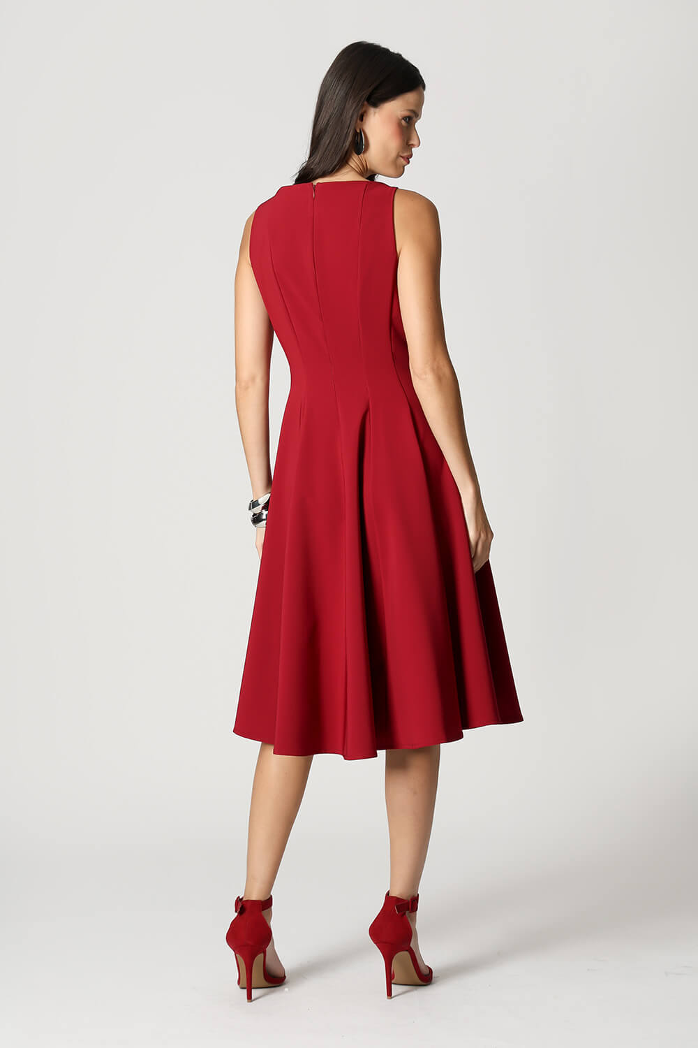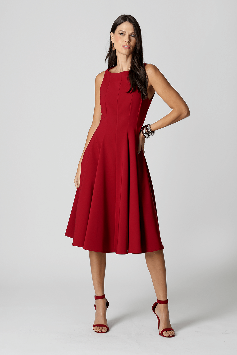 Vestido com modelagem godê e cintura marcada, confeccionado em tecido de alfaiataria que garante elegância e ótimo caimento. Ideal para ocasiões que pedem um look sofisticado e feminino.