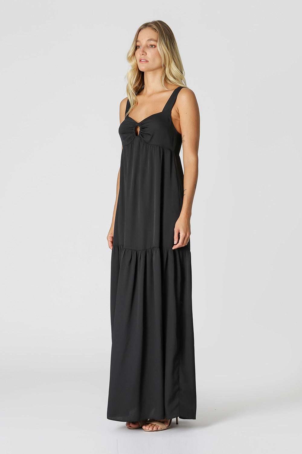 Vestido longo com silhueta levemente solta, alças largas e detalhe vazado no busto. Use em um look de verão e arrase!