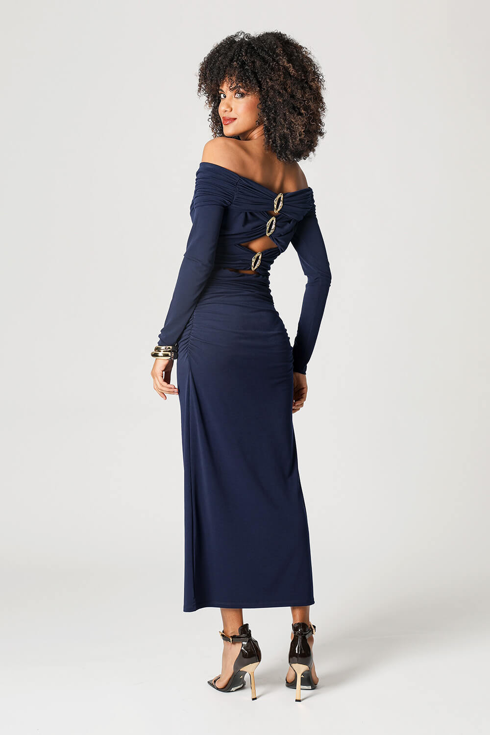 Este vestido ombro a ombro é cheio de estilo e versatilidade, com drapeado entre as fivelas de metal, criando uma abertura sofisticada e moderna. Pode ser usado tanto na frente quanto nas costas, oferecendo diferentes formas de compor o visual. Perfeito para ocasiões especiais ou looks descontraídos com um toque elegante.