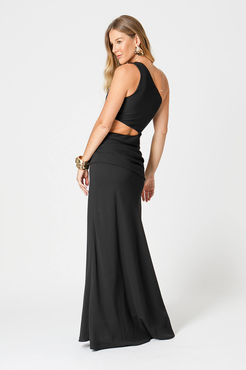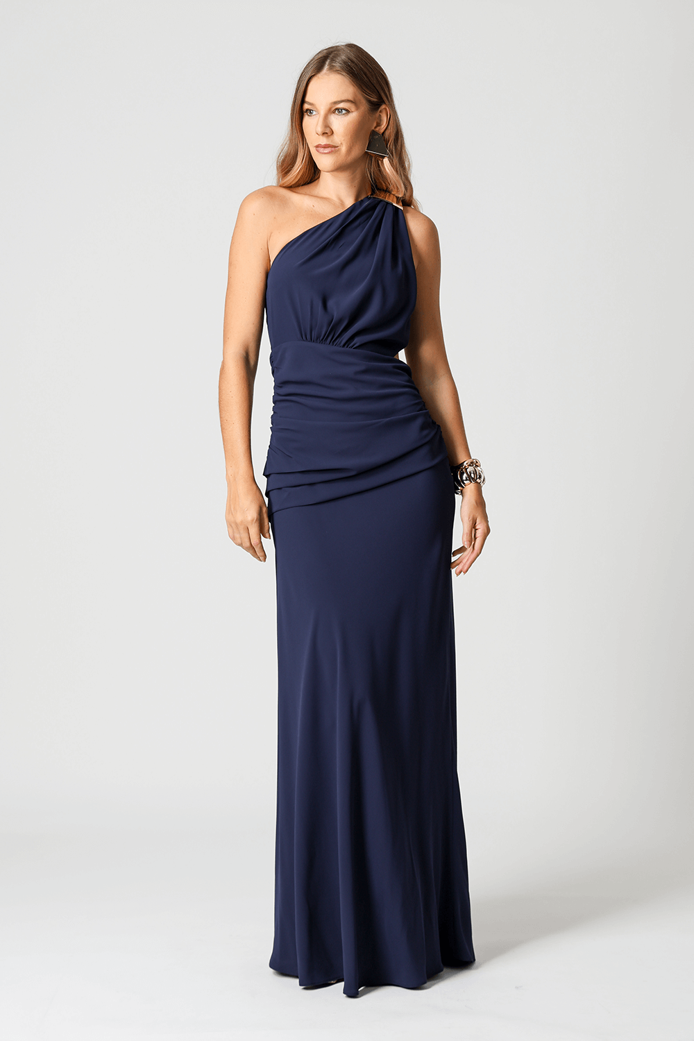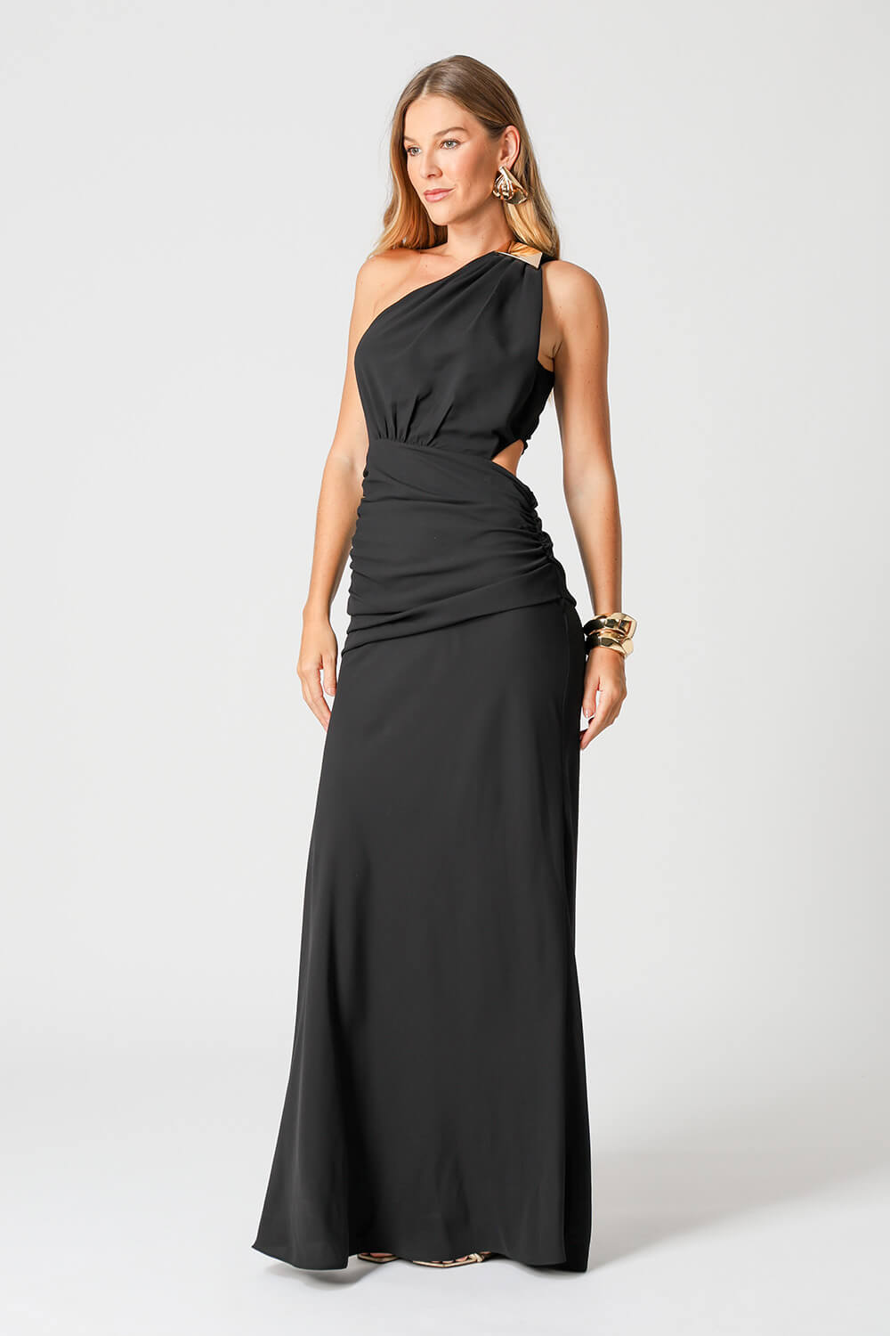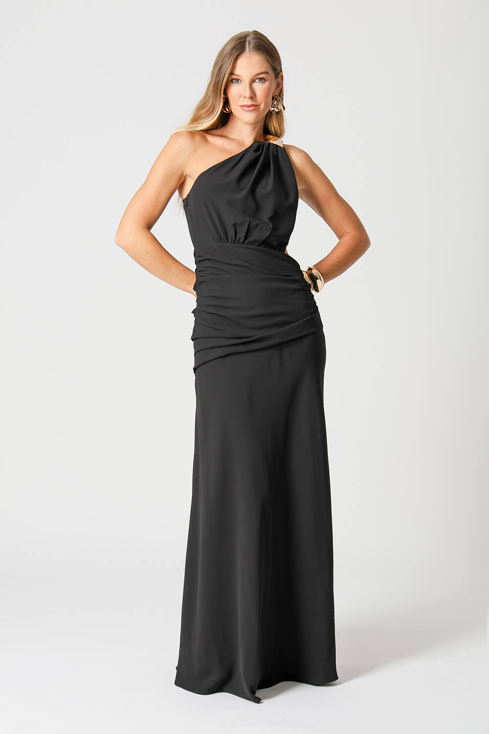 Vestido de um ombro único em crepe premium, com drapeado elegante e fivela dourada que destaca a silhueta. Sofisticado, moderno e ideal para composições marcantes.