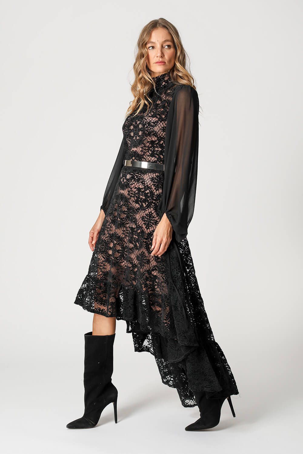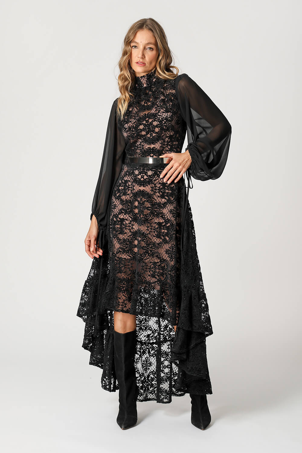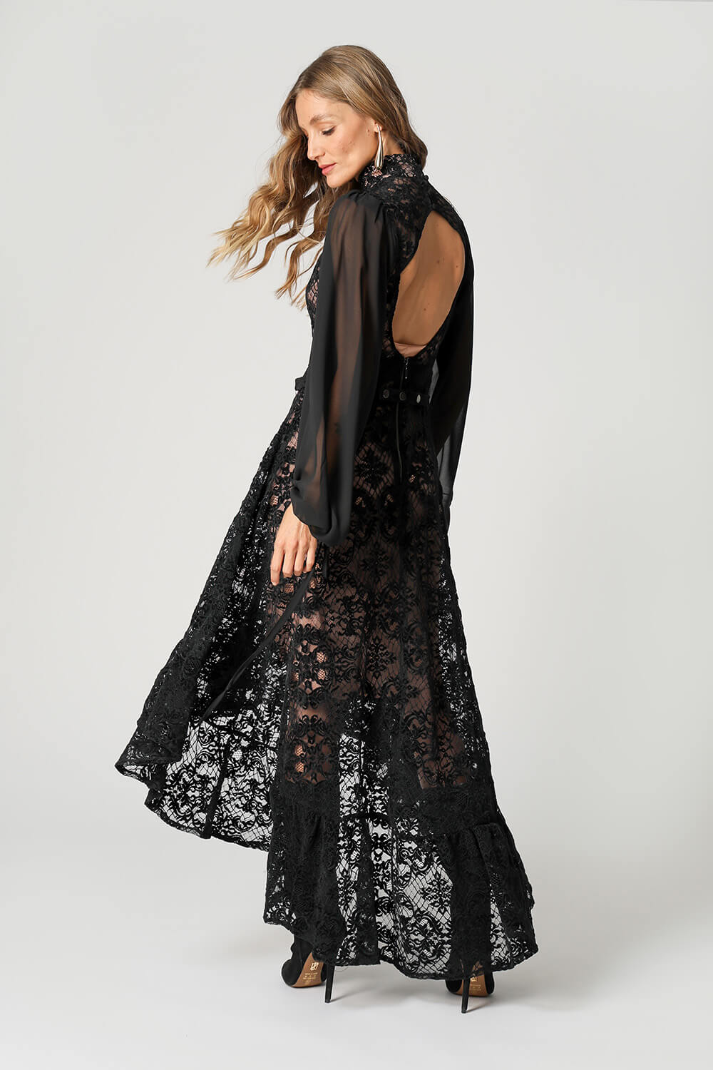 Elegante e impactante, esse vestido é a definição de sofisticação com um toque ousado. Confeccionado em renda delicada, ele traz mangas longas que equilibram perfeitamente com as costas abertas, criando um visual moderno e marcante. Ideal para ocasiões especiais.