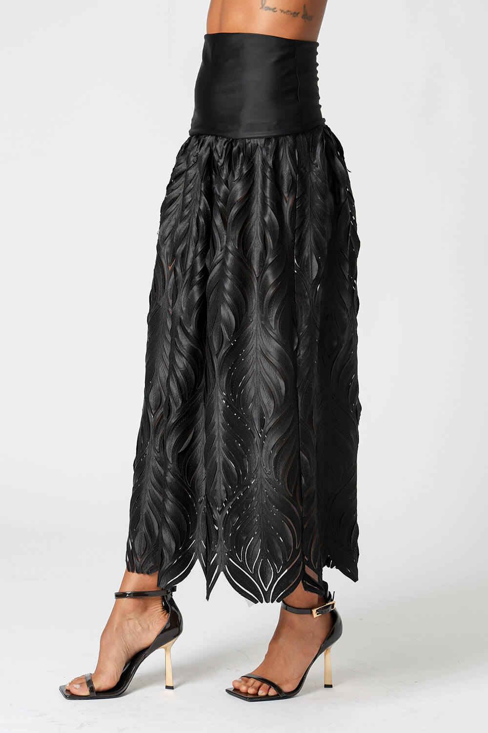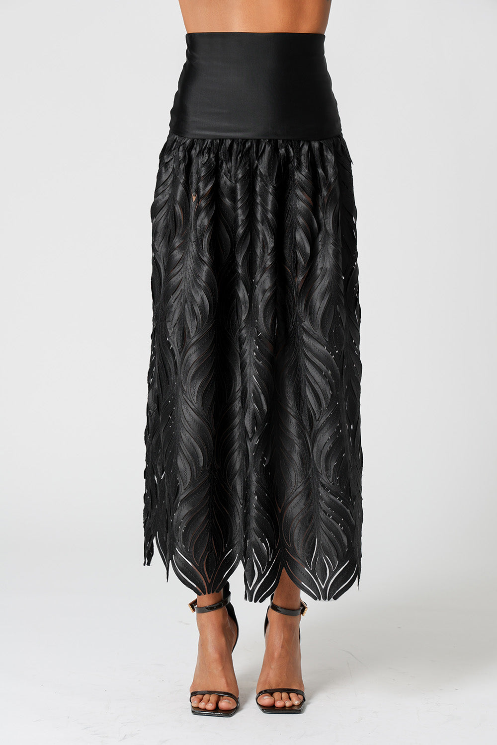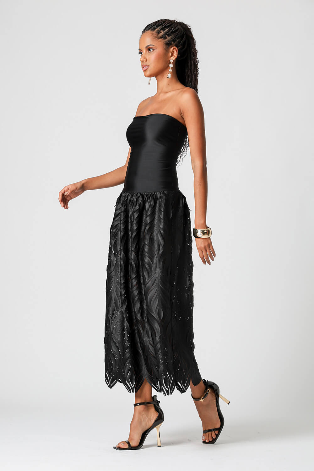 Vestido Strapless com corpo em malha microfibra e saia em tule bordado a laser com sobreposição. Versátil, leve e elegante para diferentes ocasiões.