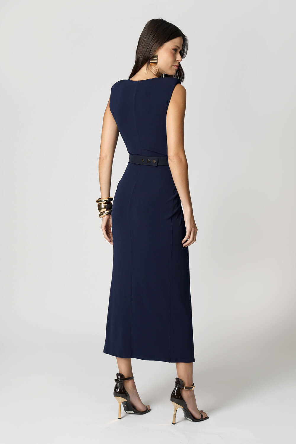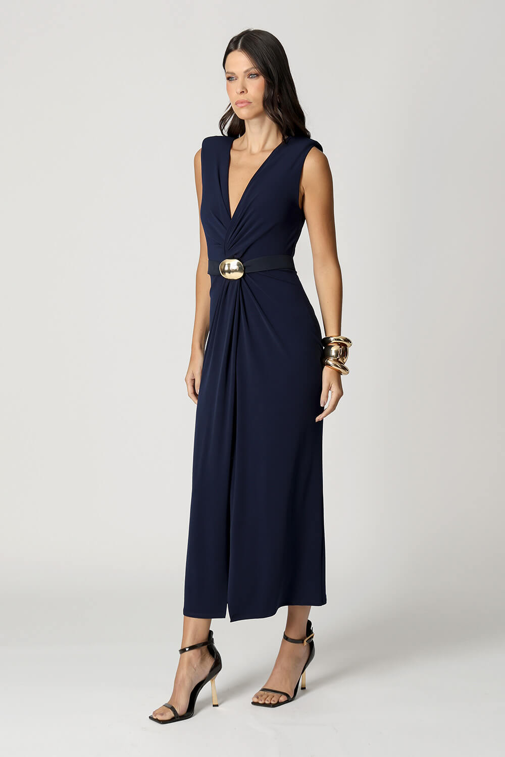 Vestido com decote profundo e detalhe twist frontal que valoriza o colo com elegância. A fenda frontal adiciona sensualidade na medida certa, enquanto as ombreiras marcantes trazem estrutura e um toque de poder ao look. Ideal para ocasiões especiais e eventos noturnos.